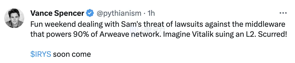 · 社区:Sam 指责 Irys 好比「Vitalik 起诉 L2」