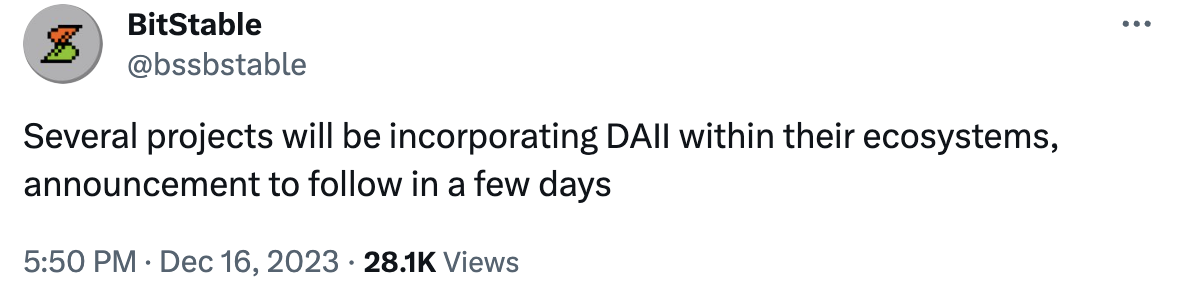 DAII 是 BitStable 所发行的美元稳定币,DAII 的总供应量为 10 亿枚。用户可以在 BitStable 官网通过质押 ORDI 或 MUBI 获取,项目方也在以太坊上发行了部分 DAII,可直接购买。