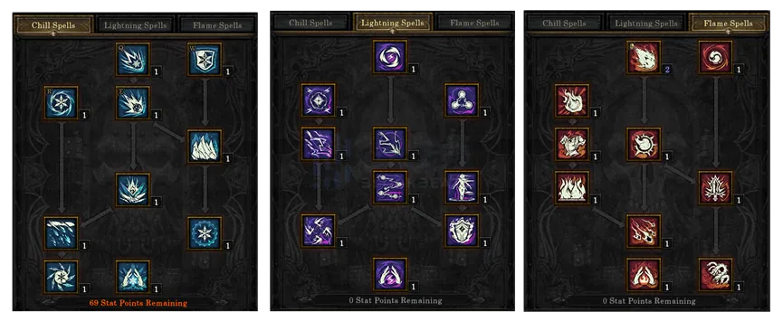 在游戏中升级可以获得技能点,当使用技能点升级技能时,玩家可以选择升级不同的技能使自己的角色向不同的流派发展。以「女巫」职业为例,玩家们可以将自己的角色培养成「冰霜」、「闪电」或是「火焰」三种各具特色的流派。
