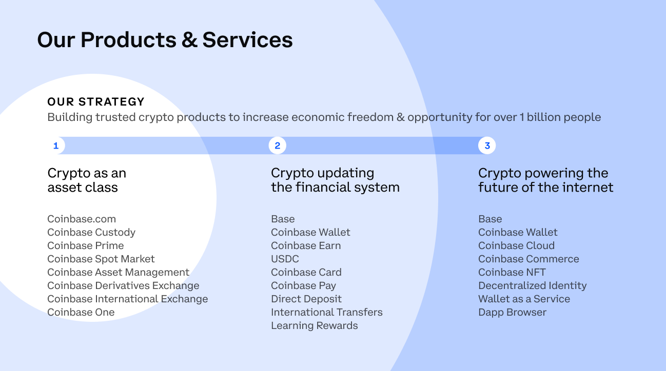 Coinbase 正在构建一个规则清晰、合作广泛和产品及设施可信的赛道,以支持如今和未来的创新。从目前正在进行的金融系统更新,到加密货币的下一篇章——即当全球 10 亿人使用加密货币驱动的去中心化服务、云服务和商业服务时,最终可以证明区块链(onchain)即是新的互联网。