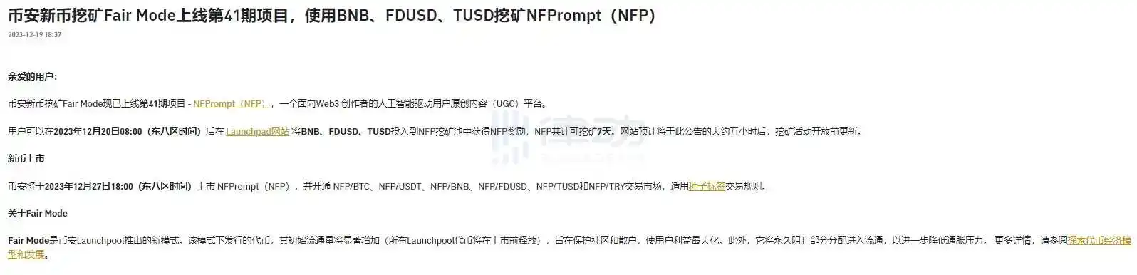 12 月 19 日,据官方消息,Binance 新币挖矿 Fair Mode 上线第 41 期项目,使用 BNB、FDUSD、TUSD 挖矿 NFPrompt(NFP)。用户可以在 12 月 20 日 08:00(东八区时间)后在 Launchpad 网站 将 BNB、FDUSD、TUSD 投入到 NFP 挖矿池中获得 NFP 奖励,NFP 共计可挖矿 7 天。