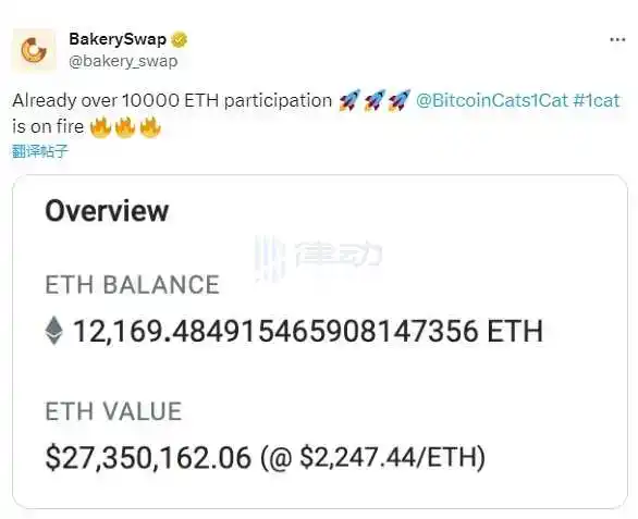 12 月 19 日,BakerySwap 在其社交平台表示,已有超 1.2 万枚 ETH 参与比特币链游项目 Bitcoin Cats Launchpad。