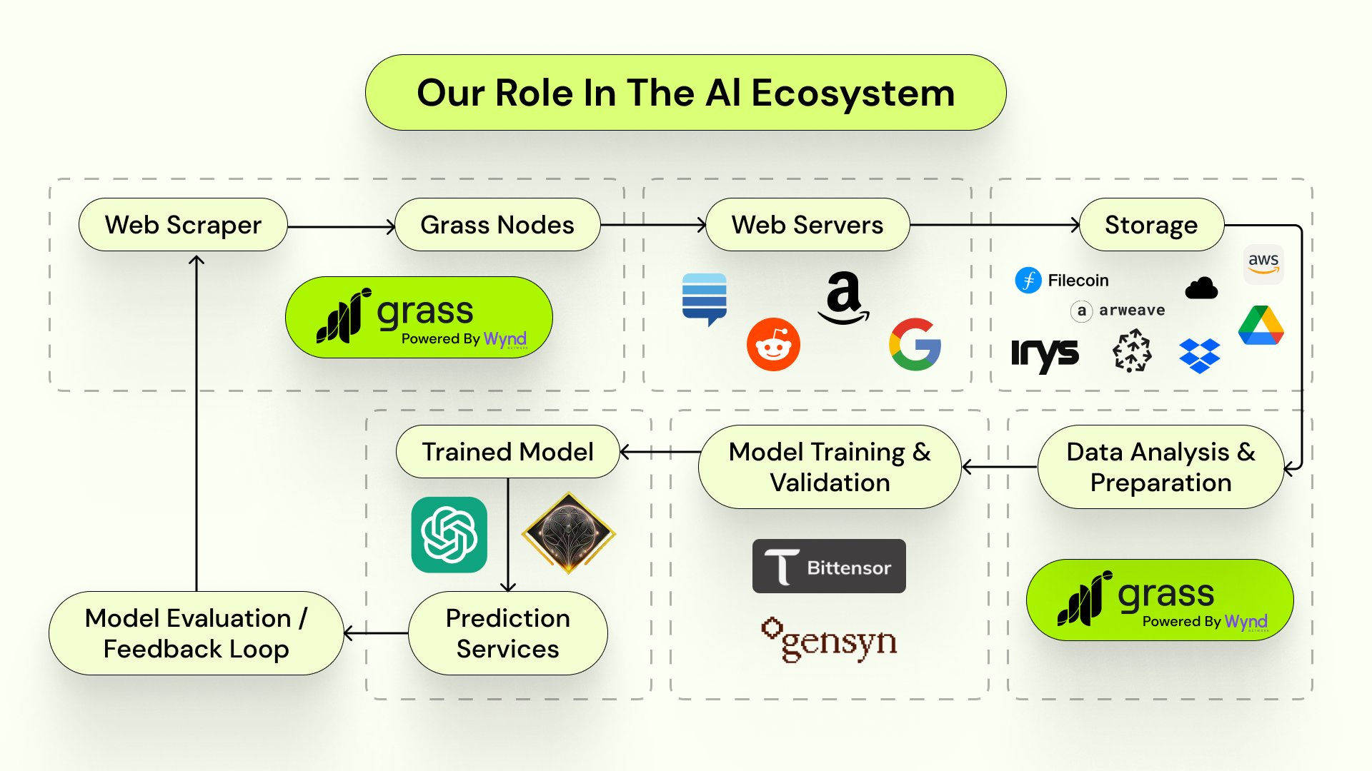Grass 的机制是用户将自己未使用的网络资源通过 Wynd Network 出售给公司、实验室等机构,Grass 的买家公司寻求未使用的网络资源来访问更多样化的 IP 地址,进行市场调查或执行网络抓取、训练 AI 等任务。