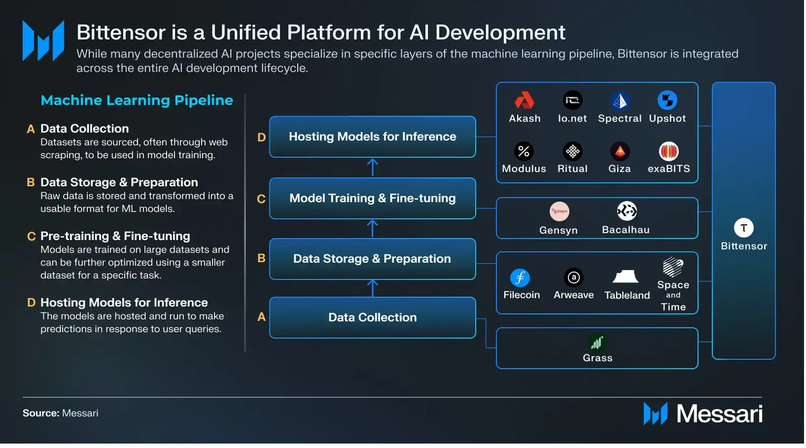 这次的用户激增的原因可能有一部分是蹭上了 Bittensor 的热点。Messari 研究员Sami Kassab在推特上发布了关于 Bittensor 的研究,Bittensor 是一个 Crypto+AI 概念项目,其代币 TAO 在 11 月价格上涨了 400%,跻身加密货币市值前五十。Sami 认为 Bittensor 是一个集合了去中心化 AI 各阶段服务商的平台,在 AI 数据收集这一类别中,Grass 是唯一被列出的项目。