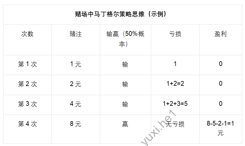 马丁格尔逻辑最早起源于十八世纪法国的小镇赌博,从第一笔掷骰子开始,如果输钱后就将赌注翻倍,由于每笔交易胜负的概率都是 50%,只要不断的赌下去,总有一次可以将所有亏损赢回来并赚取第一笔本金同等金额。比如,第一次赌注为 1 元,第 4 次押注后成功,那么将弥补之前 3 次交易的损失,并且盈利 1 元。