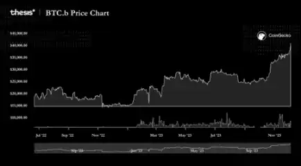比特币封装越来越受欢迎,用于在不同生态系统中转移比特币财富。一些当前流行的封装选项包括 Avalanche 的 BTC.b。BTC.b 是 Avalanche 生态系统中的 ERC-20Token,专为 Avalanche C 链设计。其桥梁采用高度安全的方式,将比特币封装到 Avalanche 生态系统中,允许用户在 Avalanche C 链上使用封装的比特币进行交易和互换。截至 2023 年 12 月 4 日,BTC.b 的市值约为 1.524 亿美元,交易活动在多个去中心化交易平台上展开。