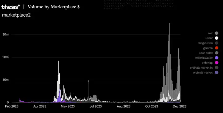 各种比特币 Ordinals 市场,包括 OKX、Uniswap、Magic Eden 和 Gamma 等平台都显示出了显著的交易量增长。