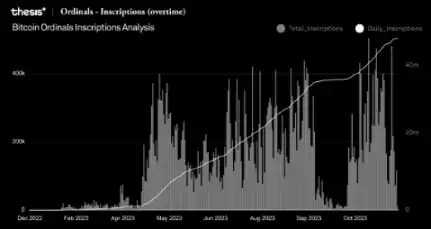 随着序数的兴起,NFT 销售额从 2021 年 9 月的 42 亿美元下降了 8.7%,降至 2023 年 10 月的 38 亿美元。序数的引入导致比特币交易费用和区块大小激增,链上出现了惊人的 4507.45 万次刻录。2023 年 11 月 12 日,比特币序数刻录数量创下每日历史最高纪录,达到了 505345 个。