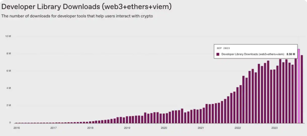 a16z 的加密货币市场状态指数或许是观察整体市场健康状况的最佳指数。它的追踪同样强调了开源开发者数量下降了 30%,但它还记录了些市场向好的数据:开发者库下载量在第三季度创下历史新高,活跃地址和移动钱包活动创下历史新低。这是点燃 2024 年加密应用爆发之火的火花吗?如果我可以根据单一图表盲目投资加密货币,那么就是这个: