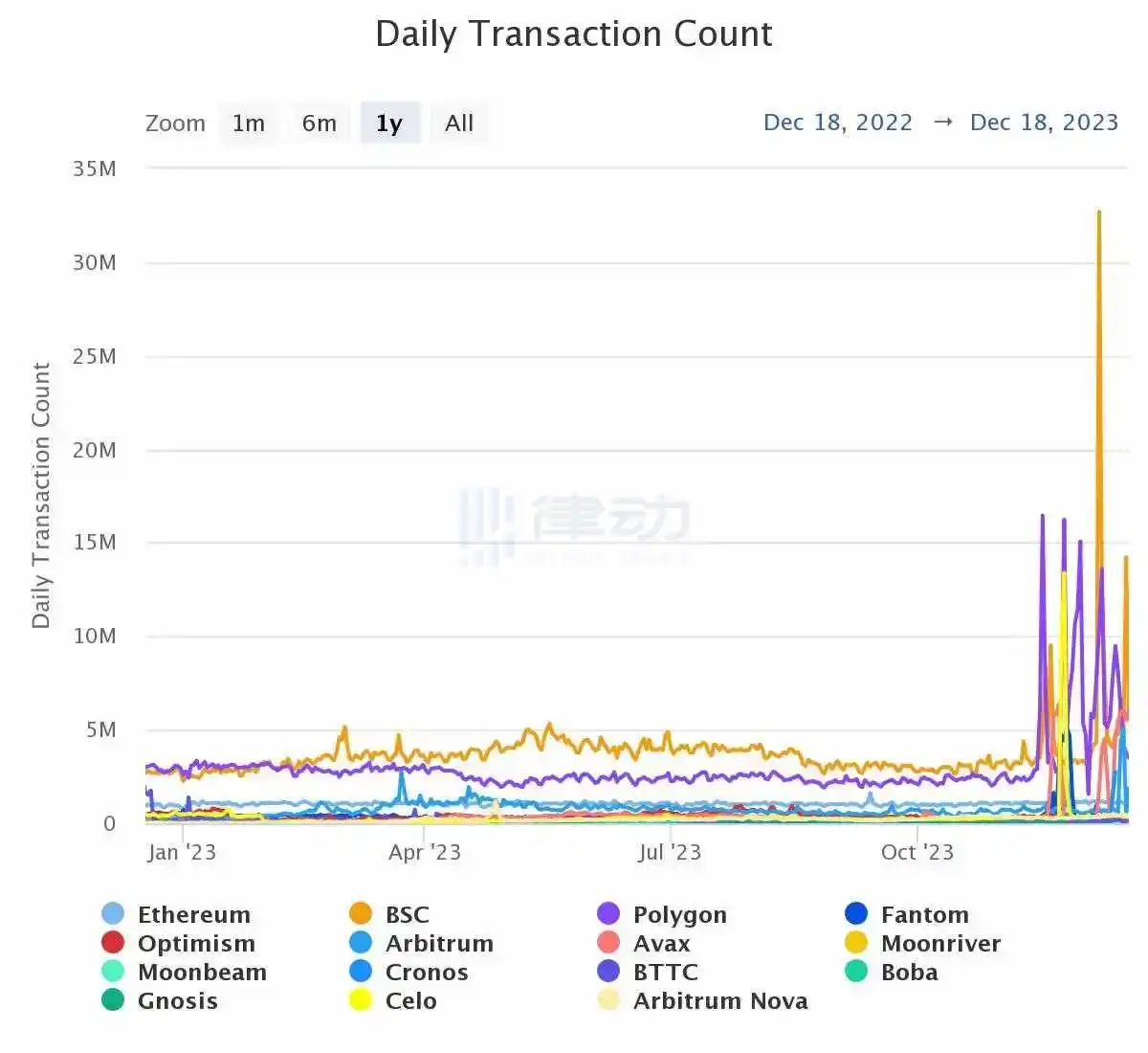 12 月 21 日,Etherscan 发推表示,过去几周主要 EVM 链上 95% 的交易活动都是铭文铭刻活动。
