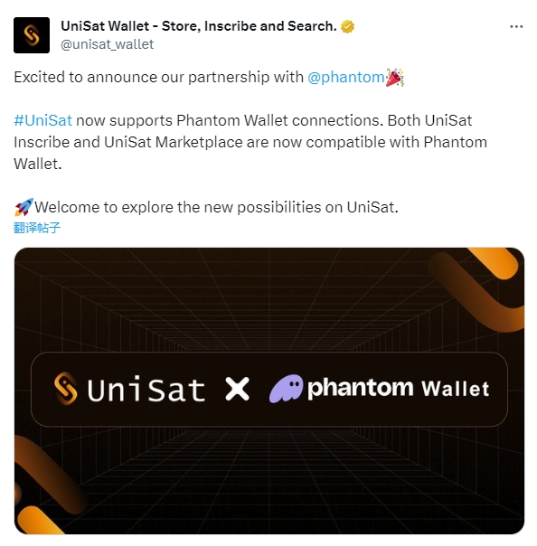 12 月 21 日,据官方消息,比特币铭文市场及钱包供应商 Unisat 宣布已支持 Phantom 钱包接入。UniSat Inscribe 和 UniSat Marketplace 现在均与 Phantom 钱包兼容。此前消息,加密货币钱包 Phantom 表示将集成比特币网络。