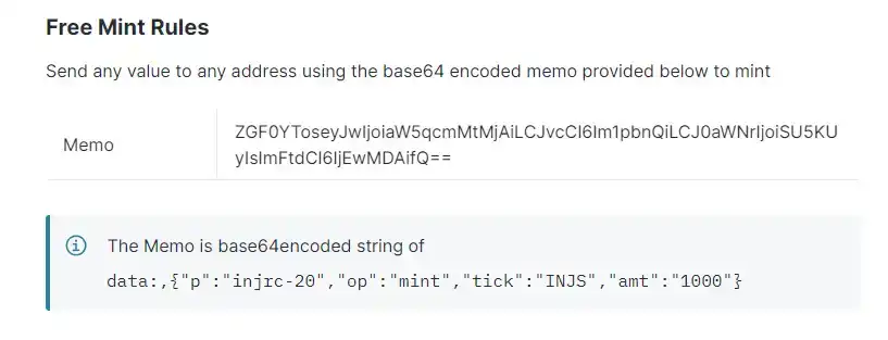12 月 20 日,Injective 铭文项目 INJS 在社交媒体上发文表示,该项目铸币将于北京时间 22 时重启,会在重启铸币前 1 小时(21 日 21 时)公布有效区块信息。据铸币规则显示,新规则下,用户铸币时无需将币发送至项目方地址,填写正确的 memo:ZGF0YToseyJwIjoiaW5qcmMtMjAiLCJvcCI6Im1pbnQiLCJ0aWNrIjoiSU5KUyIsImFtdCI6IjEwMDAifQ==,交易发送至任何地址皆可完成铸币。