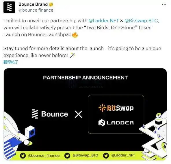 12 月 21 日,Bounce Launchpad 公布「一石二鸟」(Two Birds, One Stone)的 Launchpad 项目,分别是为 NFT AMM 协议 Ladder Protocol 以及比特币生态跨链交易协议 Bitswap。