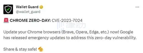 12 月 21 日,Web3 安全机构 Wallet Guard 发文表示,建议用户及时更新 Chrome 浏览器(包括 Brave、Opera 和 Edge),修复新的零日漏洞(CVE-2023-7024)。