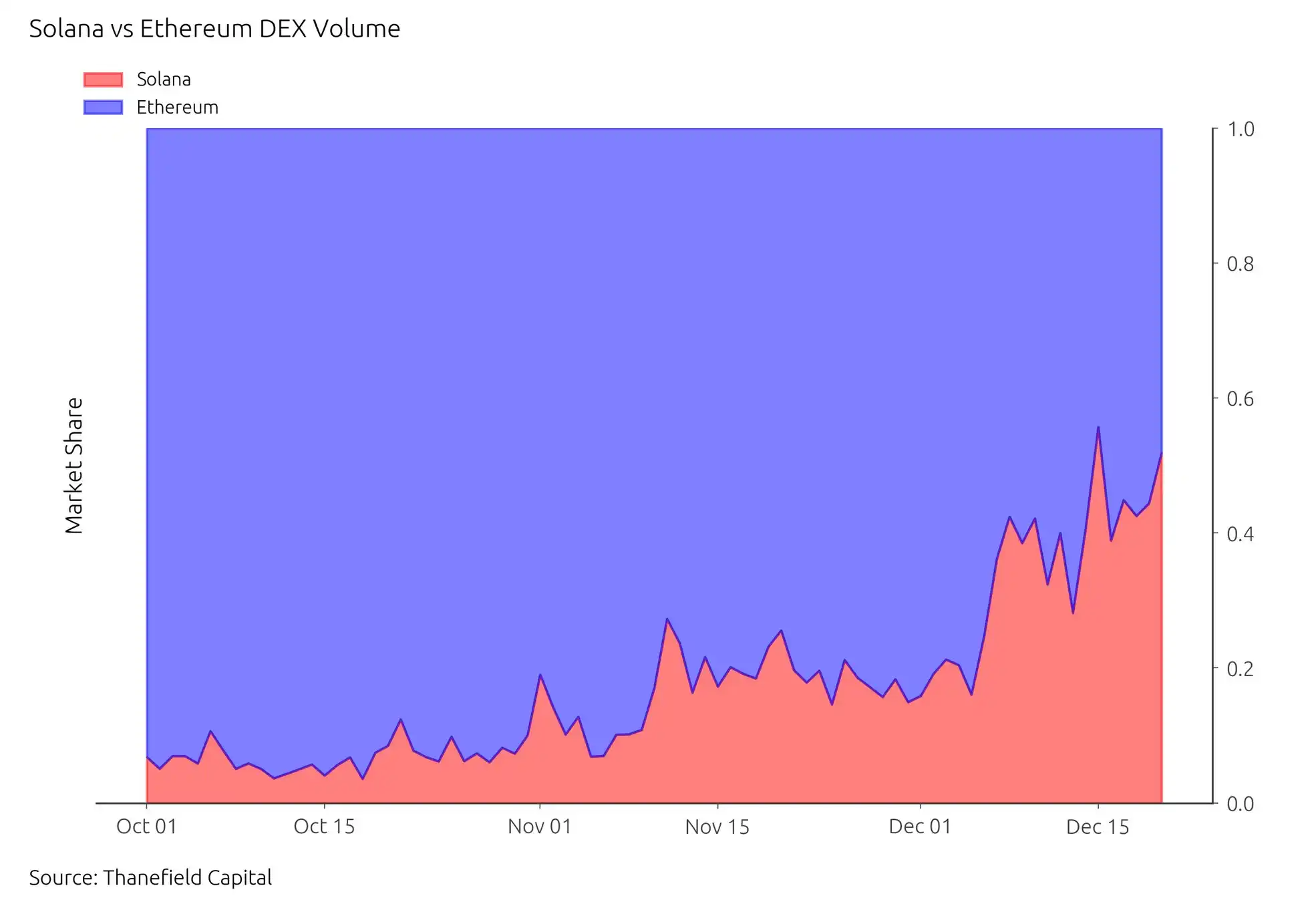 分析师认为,通过低成本的费用和更快的交易提供更好的用户体验,再加上生态系统中最近的财富效应,Solana 获得市场份额的趋势可能会持续下去,成为新的加密交易中心。而这正是 Solana 联合创始人 Anatoly 的巨大愿景,在链上完全重建纽约证券交易所或纳斯达克。