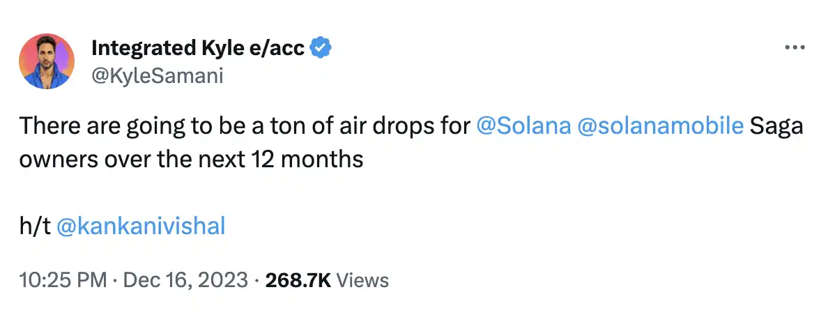 在此之前,热度最先被顶上去的是 Bonk,一个曾救 Solana 于水火之中的 meme 币。随着 Bonk 价格拉升,Solana Labs 发布的 Web3 手机 Saga 也在二级市场获得了超高溢价,因为每款 Saga 手机都有权获得高达 3000 万枚 BONK 代币空投。前几日,Multicoin Capital 的联合创始人 Kyle Samani 在社交平台上表示,预计未来 12 个月内 Solana 手机 Saga 所有者将获得大量空投活动。这也为 Solana 的 meme 季添了一把干柴。