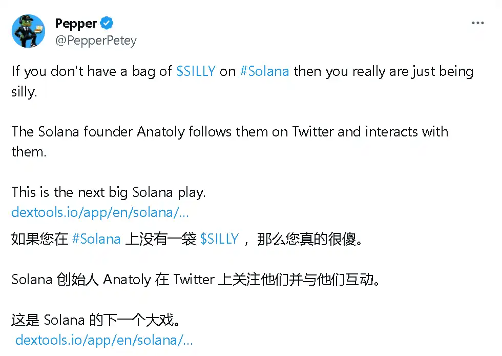 Anatoly 关注并转发 Silly Dragon 推文的截图也在社区引发讨论,这也因此成为很多人看涨 SILLY 的原因。加密研究员 Pepper(@PepperPetey)在社交媒体平台发文表示「这是 Solana 的下一个大戏」。