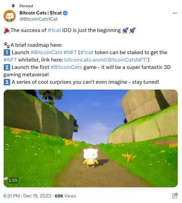 Bitcoincats 还没有放出有关游戏的具体信息,根据官网显示,游戏可能涉及对战、社交、耕种等玩法,其官方网站上线于 12 月 11 日。在 IDO 成功后,Bitcoin Cats 在在社交媒体上发布了「简短路线图」,首先是将开启质押 1 Cat 代币获得 NFT 白名单的活动,然后将推出 Bitcoin Cats 第一款游戏,将涉及 3D 元宇宙等元素,但并没有提到具体的时间。