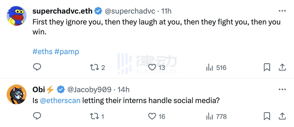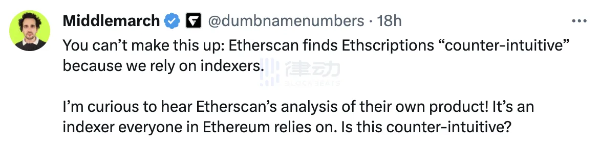 他在社交平台发文指出,Etherscan 发现以太坊铭文「违反直觉」,因为人们依赖索引器:「我很好奇 Etherscan 对他们自己产品的分析,它是以太坊中每个人都依赖的索引器,这是违反直觉的吗?」