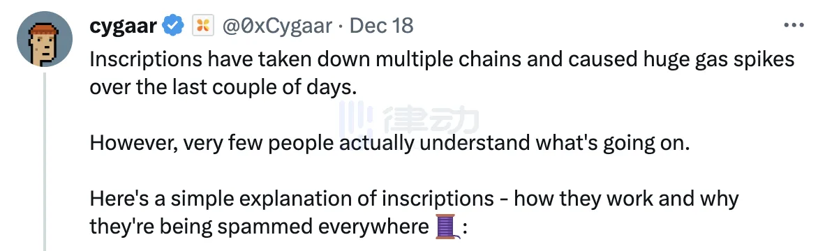 或许是为回复社区其余用户的质疑声,0xCygaar 随后继续发文表示,支持用户用铭文做自己想做的事,而自己仅是讨论技术架构、扩展解决方案以及 rollup 的工作原理:「我不在乎你是否想铸造和交易铭文,只是不要把它当作一个全新的概念来宣传,这些铭文协议只是极其有限的 rollup。」