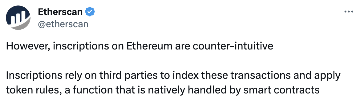 Etherscan(@etherscan)发文指出,过去几周主要 EVM 链上 95% 的交易活动都是铭文,但以太坊上的铭文是「违反直觉」的,铭文依赖第三方对这些交易进行索引并应用代币规则,这是由智能合约本地处理的功能。
