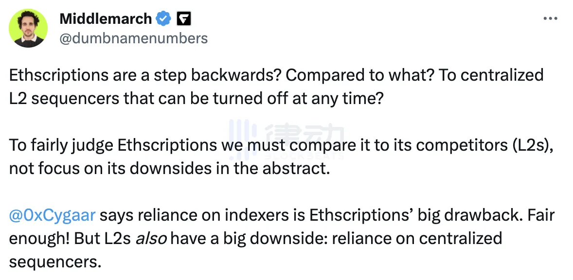 在随后的帖子中,Middlemarch 继续输出,并表示以太坊铭文是否是一种倒退,要看与什么相比。如果与 L2 进行比较,那严格来说 L2 也有一个很大的缺点——依赖集中式排序器。