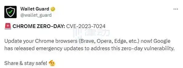 Web3 安全机构 Wallet Guard 发文表示,建议用户及时更新 Chrome 浏览器(包括 Brave、Opera 和 Edge),修复新的零日漏洞(CVE-2023-7024)。