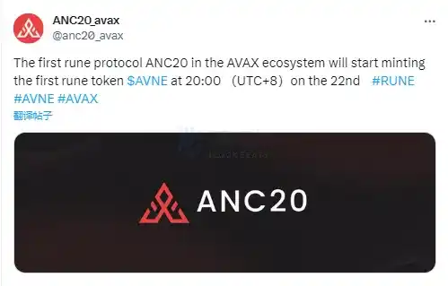 AVAX 生态中首个符文协议 ANC20 的首个符文代币 AVNE 将于 12 月 22 日 20:00(UTC+8)开启 mint。