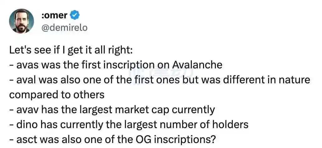 Avalanche 高管 omer 于社交平台上发文称,avas 是雪崩链第一个铭文,同时被提及的还有市值最大的铭文 avav,持有者最多的铭文 dino,以及 OG 铭文 asct 等。