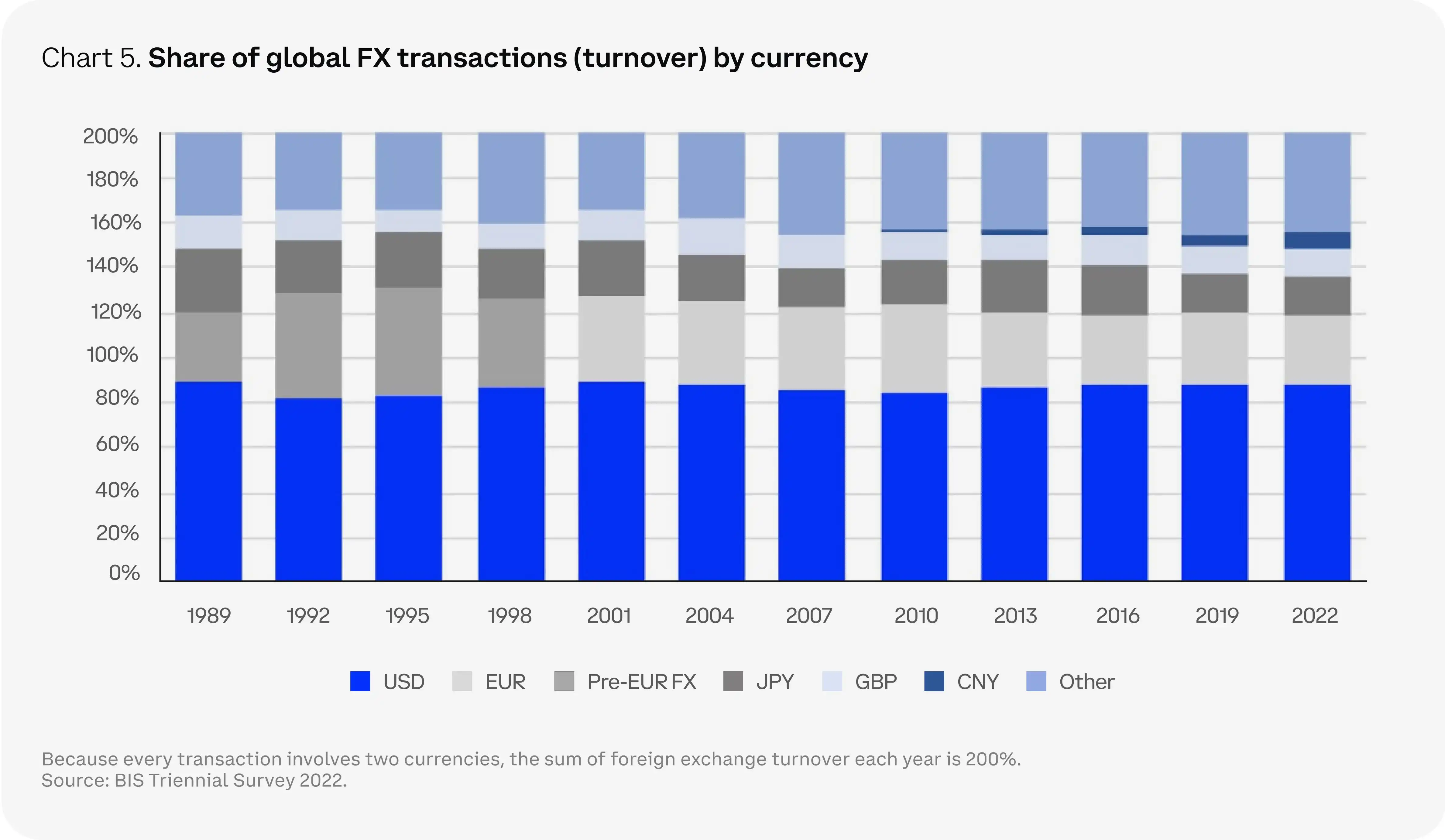 另一方面,摆脱美元化主题自 1980 年代初以来一直是讨论话题,尽管如此,美元仍然是世界储备货币。事实上,美元在全球金融和贸易中的超大规模作用意味着美元在所有国际交易中的份额在过去四十年中一直保持在 85-90% 左右。改变的是,随着美国因乌克兰战争对俄罗斯实施更多制裁,全球金融的武器化开始了。这加速了开发新的跨境支付解决方案的兴趣,因为越来越多的国家正在达成双边协议,以减少对美元的依赖。例如,法国和巴西(以及其他国家)已经开始用中国人民币结算商品贸易。此外,还在进行中央银行数字货币的更多试验,以避免当今繁琐的代理银行系统。