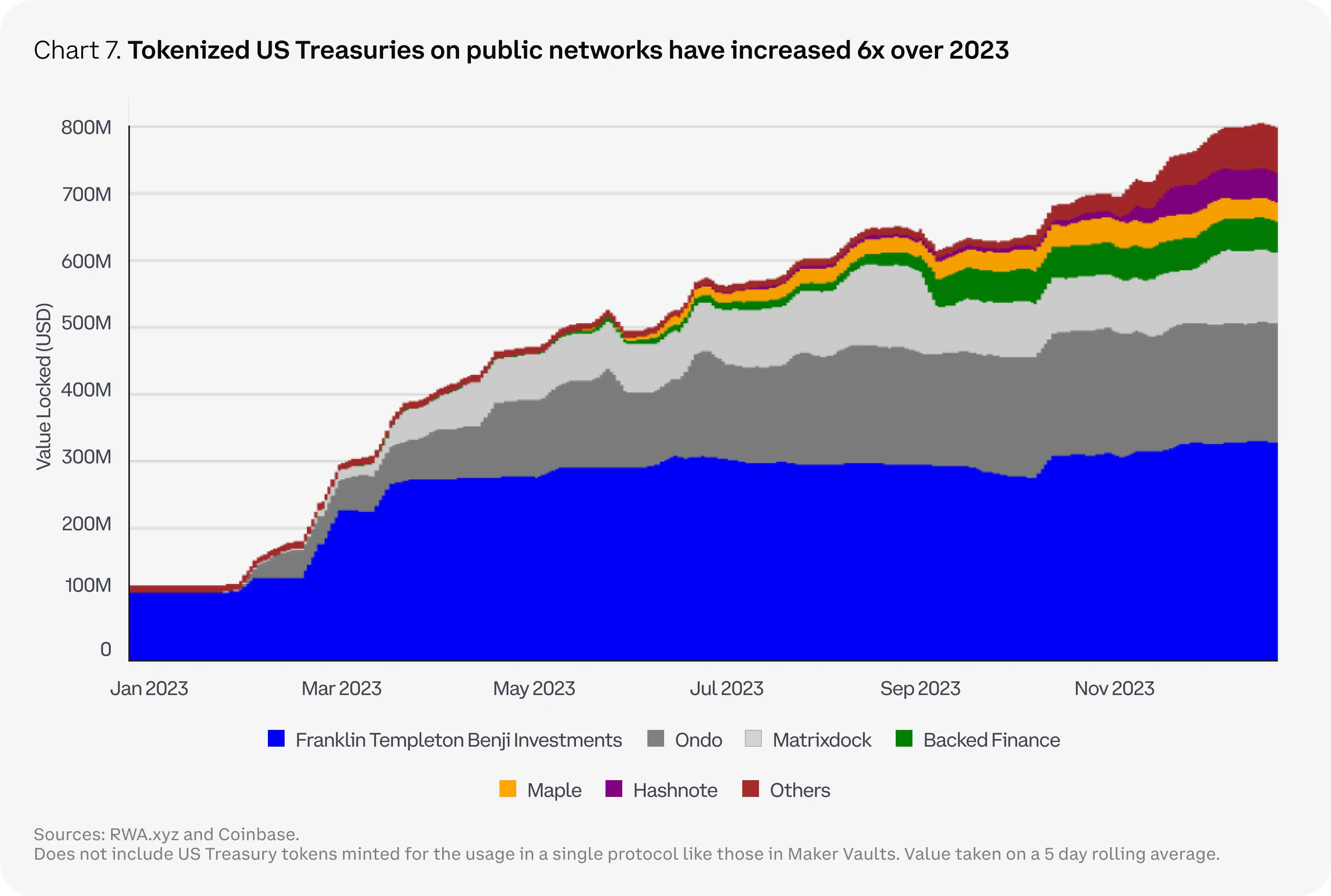 在 2023 年的过程中,我们目睹了许多新入场者在公开的无需许可的网络上开始提供对链上美国国债敞口的代币化访问。由于数字原生用户寻求获得与传统加密货币收益来源无关的收益,因此链上美国国债类敞口的总资产增加了 6 倍,达到超过 7.86 亿美元。考虑到客户对更高收益产品的需求以及对多元化回报来源的需求,到 2024 年,我们可能会看到代币化扩展到其他市场工具,包括股票、私募市场基金、保险和碳信用额。