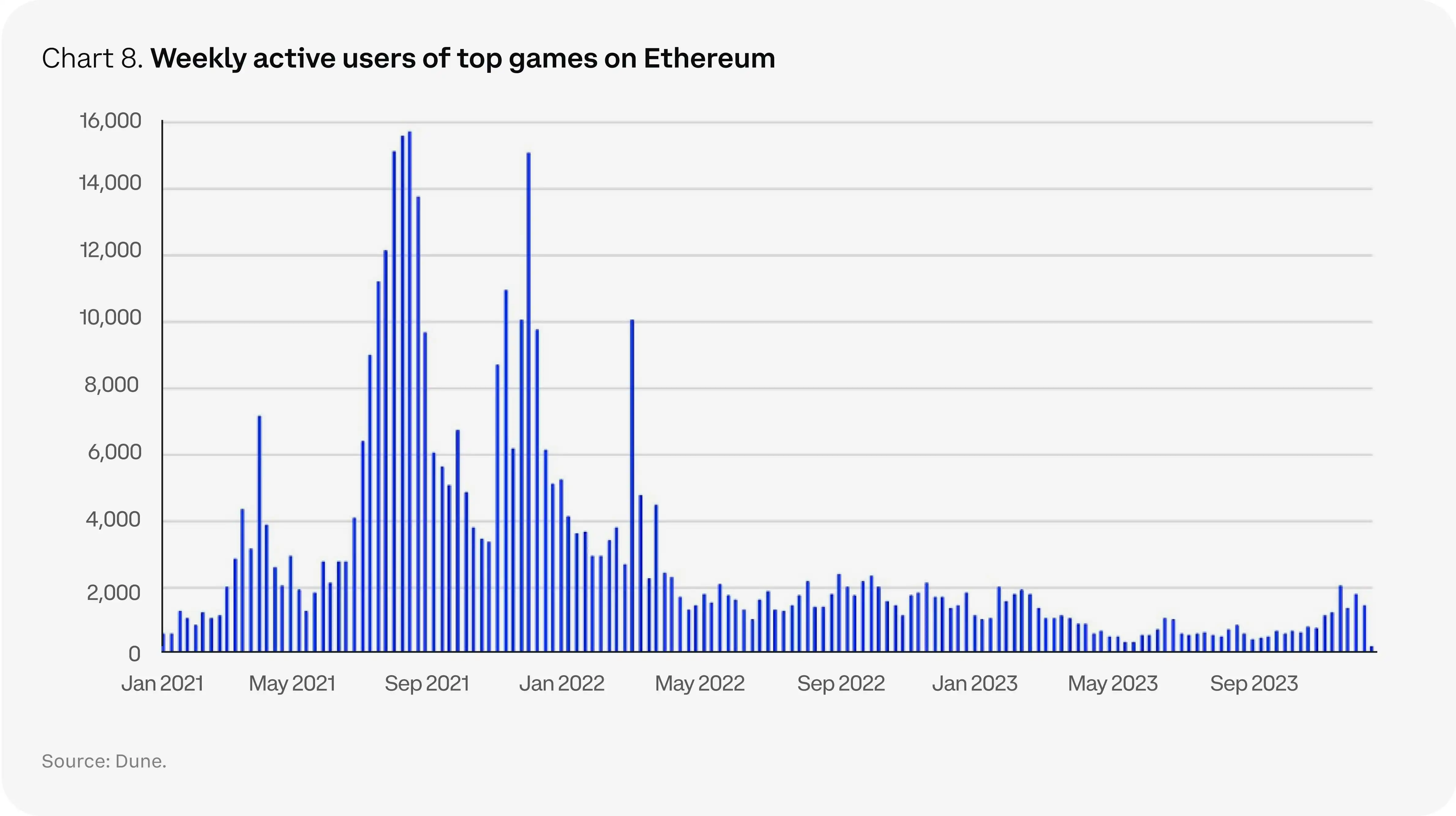 这促使开发人员进行更多的实验,他们试图将高质量 AAA 游戏的网络效应与可持续的金融化机制相结合。例如,游戏工作室考虑使用 web3 叙事,如非同质化代币(NFT),可以在游戏中使用、转移或在指定市场上出售。然而,调查表明,大多数游戏玩家不喜欢 NFT,这广泛反映了他们对」Play to earn「的拒绝。对于游戏行业来说,利用 web3 架构的增值之处在于它有望提高用户获取和保留率,但到目前为止,这仍然是一个未经证实的论点。随着许多项目的游戏开发过程达到 2-3 年的标准(继 2021-2022 年大量筹资之后),我们认为 2024 年可能发布的一些 web3 游戏可能很快就会给我们提供我们需要的数据和统计数据,以更好地评估这个部门。