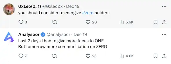 在 Analysoor 疲于为 ONE 系列做「售后服务」时,ZERO 已经在两天里较高点跌去了 60%,这场实验似乎要以失败收尾。不断有 ZERO 的持有者在 Analysoor 的社交媒体评论区留言,催促其做出行动来「拯救」ZERO。