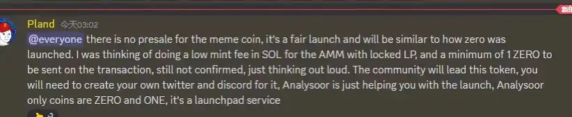 20 日,Analysoor 做出了第一个拯救行动——开放了 Discord 社区,门槛为持有 100 ZERO 或 1 ONE,100 ZERO 在当时的价值为 76 美元。在 Discord 社区中,Pland 宣布了他的计划:将推出社区主导的 meme 币,Analysoor 只负责启动代币铸造并锁定流动性池。