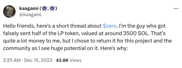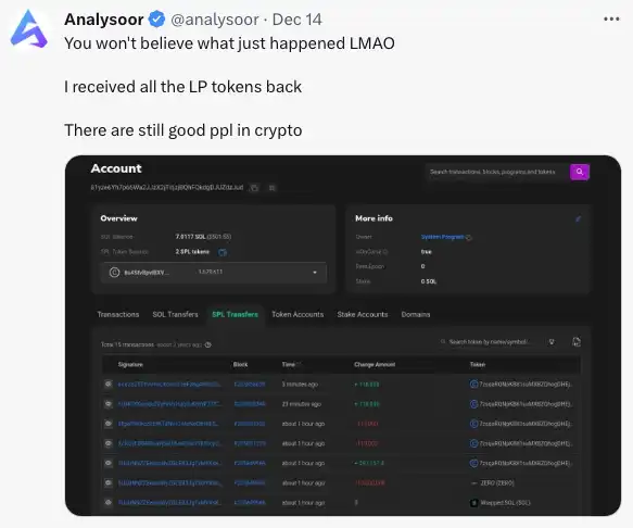这这场波折中,Analysoor 特别感谢了社区成员kaagami ,这名用户收到了一半的 LP 代币,价值约为 3500SOL。随后 kaagami 发了一篇长推来解释自己归还 ZERO 的原因,「我看到了它的巨大潜力。我个人将 Analysoor 协议解释为 Solana 上指定的一种独特的新资产分配方法。」