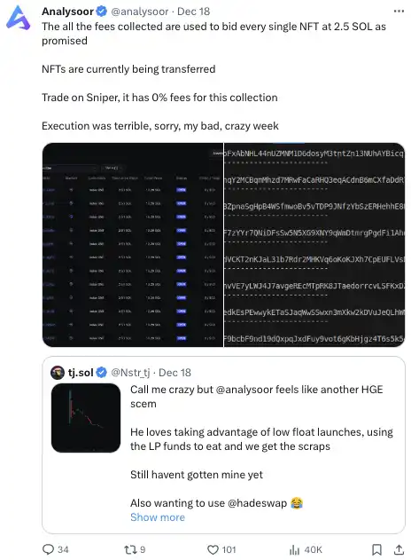 如果说这个操作还可以解释,而按照计划,ONE 系列在 mint 完毕后,将上线 Solana 上的 NFT 交易平台 SNIPER,持有者可以以 2.5SOL 的价格出售其 NFT,先前铸造时所筹集的资金会以 2.5 SOL 的价格竞标 ONE NFT。但与此同时,社区中许多用户反应自己虽然显示「中签」却一直没有得到 NFT,甚至有人说「Analysoor 看起来像另一种高 gas 费骗局」。