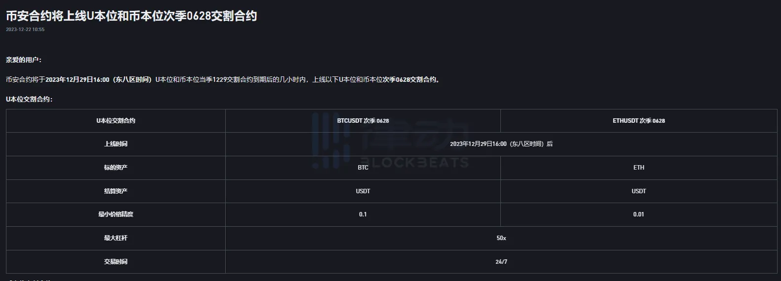 据官方公告,Binance 合约将于 2023 年 12 月 29 日 16:00(东八区时间)U 本位和币本位当季 1229 交割合约到期后的几小时内,上线以下 U 本位和币本位次季 0628 交割合约。