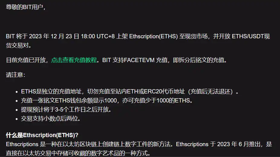 BIT 交易平台首发上线以太坊铭文 ETHS