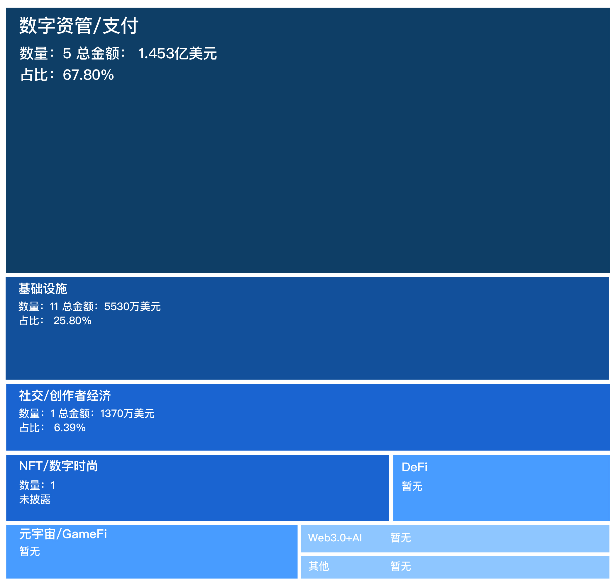 据 统计,上周的融资总数为 18 笔,数量较之前减少,总金额约为 2.143 亿美元,平均融资金额为 1190.56 万美元。其中,基础设施领域占据主体,数字资管/支付领域相对较多,社交/创作者经济和 NFT/数字时尚领域较少,DeFi 领域、元宇宙/GameFi 领域和 Web3.0+AI 领域等其他暂无。下图为上周各板块融资占比: