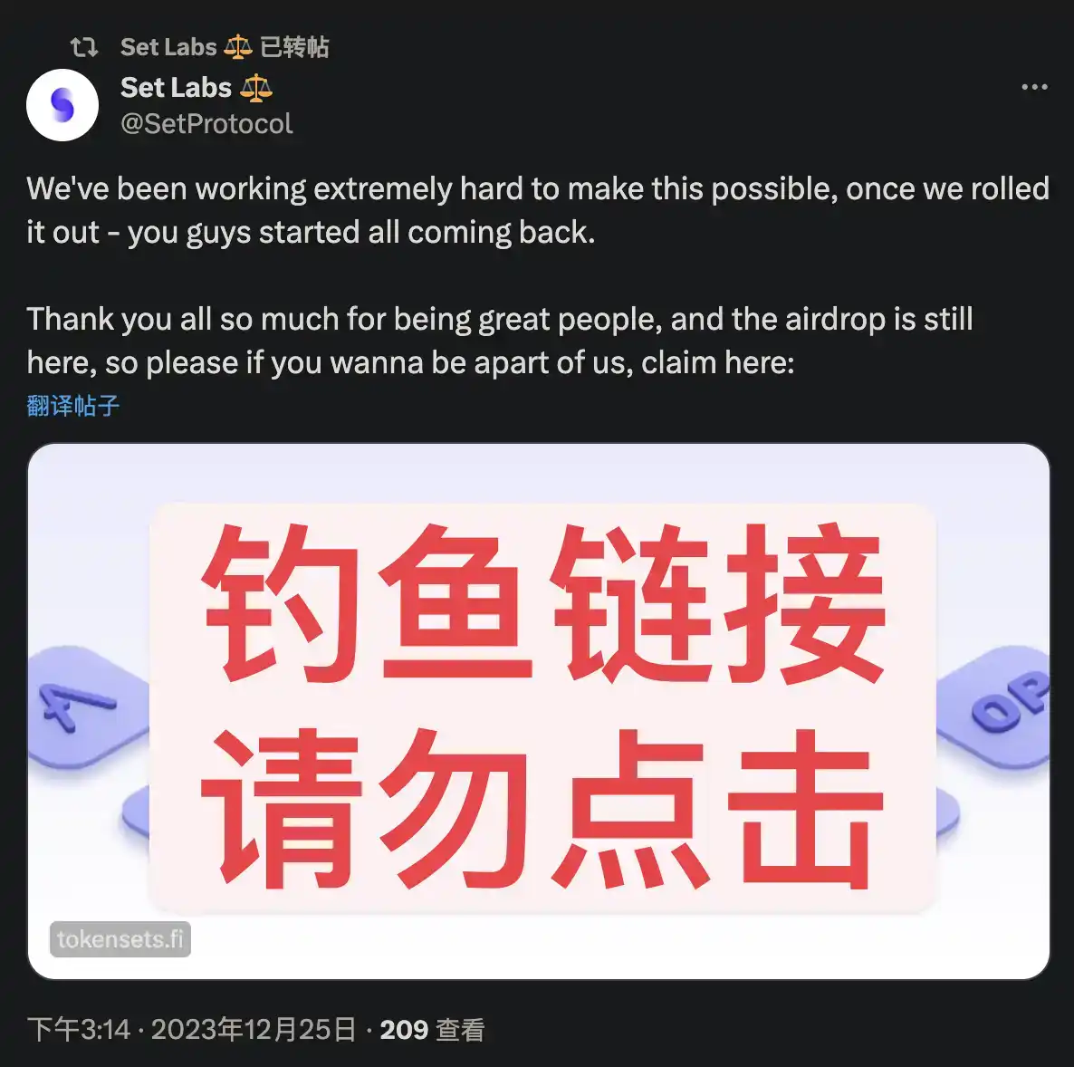 12 月 25 日,去中心化金融协议 Set Protocol 官推疑似被盗,并发布多条包含钓鱼链接的推文。