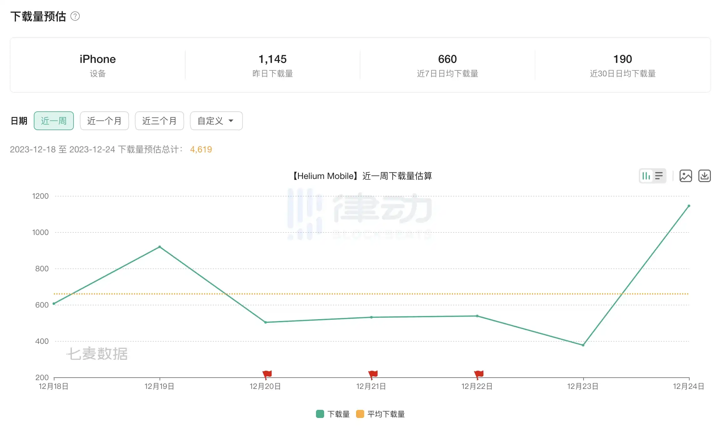 12 月 25 日,据第三方 appstore 数据平台显示,昨日 Helium Mobile 在美区 App Store 的 iPhone 用户预估下载量为 1145 次,创下近期最高记录;近 7 日日均下载量为 660 次,过去一周预估下载量总计 4616 次。
