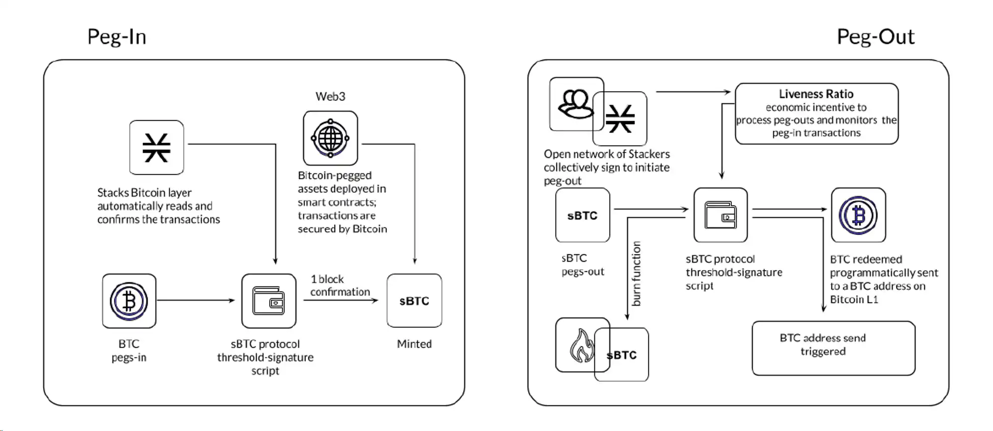 sBTC 的主要机制概括如下:用户将 BTC 发送到比特币网络上的挂钩钱包/脚本,相同数量的 sBTC 被制造和发送到用户选择的 Stacks 地址上,保持 1:1 的挂钩;当用户希望将资产发回后,sBTC 将被燃烧,BTC 将在比特币网络中被转入用户地址。由于比特币网络不具备图灵完备性,在比特币上锁定 BTC 的环节,需要通过一个托管钱包/脚本而非智能合约来完成,由一群 Signers 进行管理,当进行 Peg-out(在锚定链上燃烧锚定资产)后,必须由 Signers 手动去完成 BTC 的释放,因此,Peg-in 过程由目标链的智能合约保证资产的释放和转移,Peg-out 需要由管理者来完成资产的释放,BTC 锚定的关键点就在于 Peg-out 的过程。