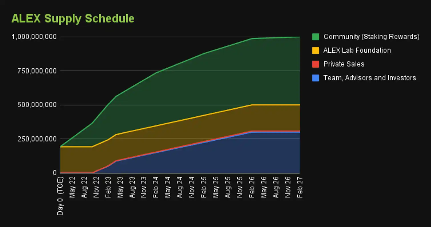 代币分配上,Alex Lab 在 2022 年 3 月进行代币发行,代币总量为 1,000,000,000 枚,预计将在五年内完全解锁(2027 年 2 月)分配情况如下:
