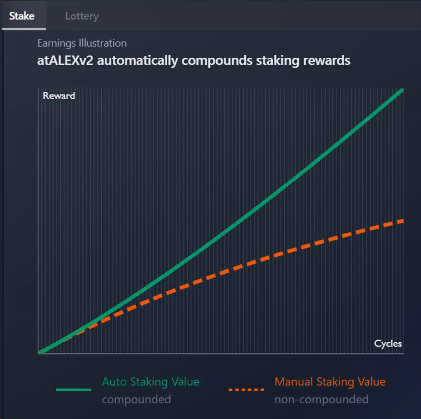 代币使用场景上,$ALEX 可以用于质押和治理。质押收益高低与是否选择自动质押有很大关系,目前总共质押了 1.4 亿枚代币,APY 为 7.25%。$ALEX 和$atALEX(自动质押的 ALEX)可以参与社区治理投票,包括代币经济学变更、IDO 项目选择等。