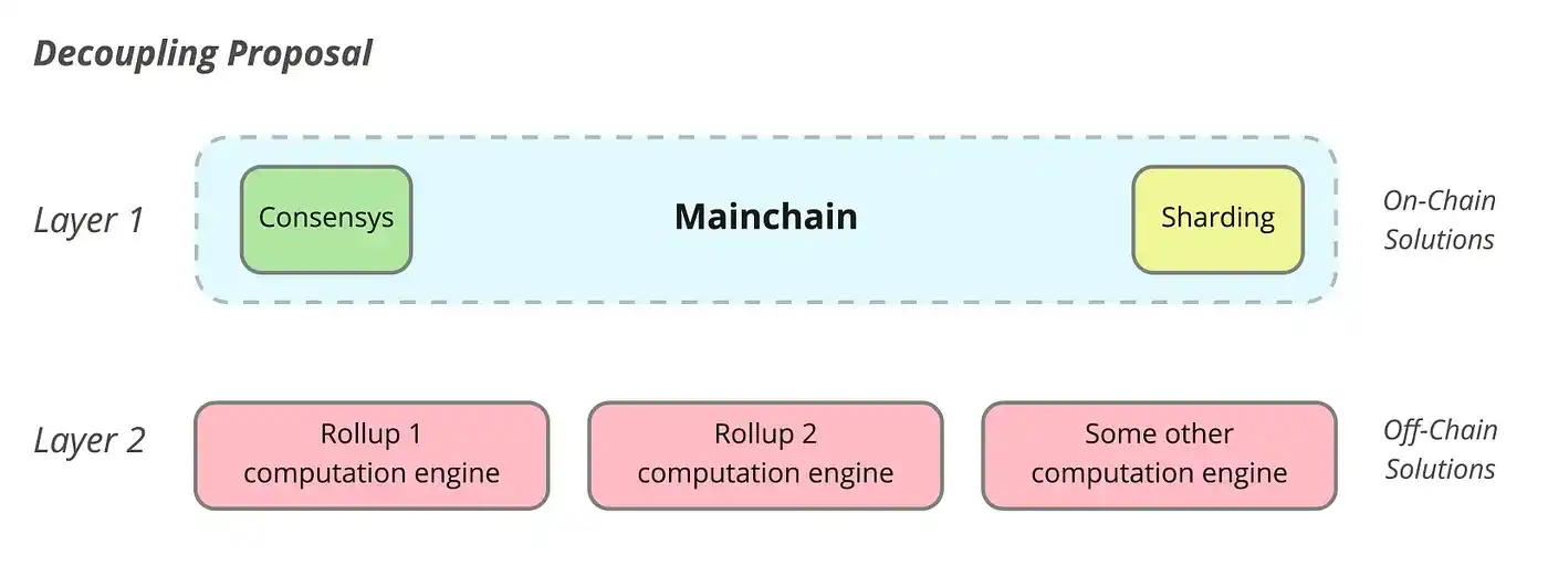 对比以太坊 2.0(ETH2.0)和 Near Protocol 主要集中在它们方法的关键差异上。以太坊的方法涉及以 Rollup 为中心的分片,其中执行层和数据可用性层被解耦。这利用了底层的 L1 来提供安全性,并通过 Rollup 实现可扩展性。