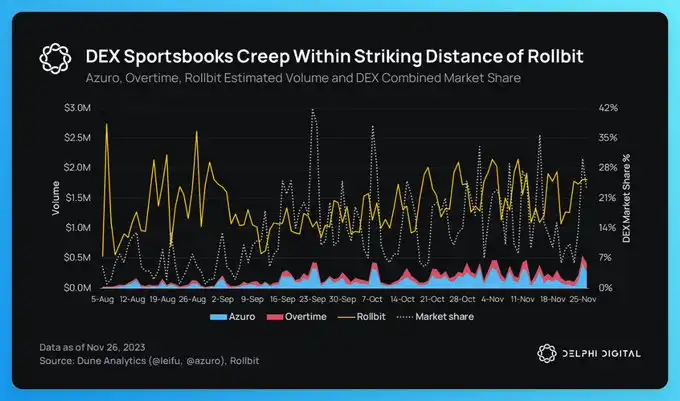 · 尽管如此,DEX 体育博彩表现相当不错,市场份额约为 Rollbit 的 20%。