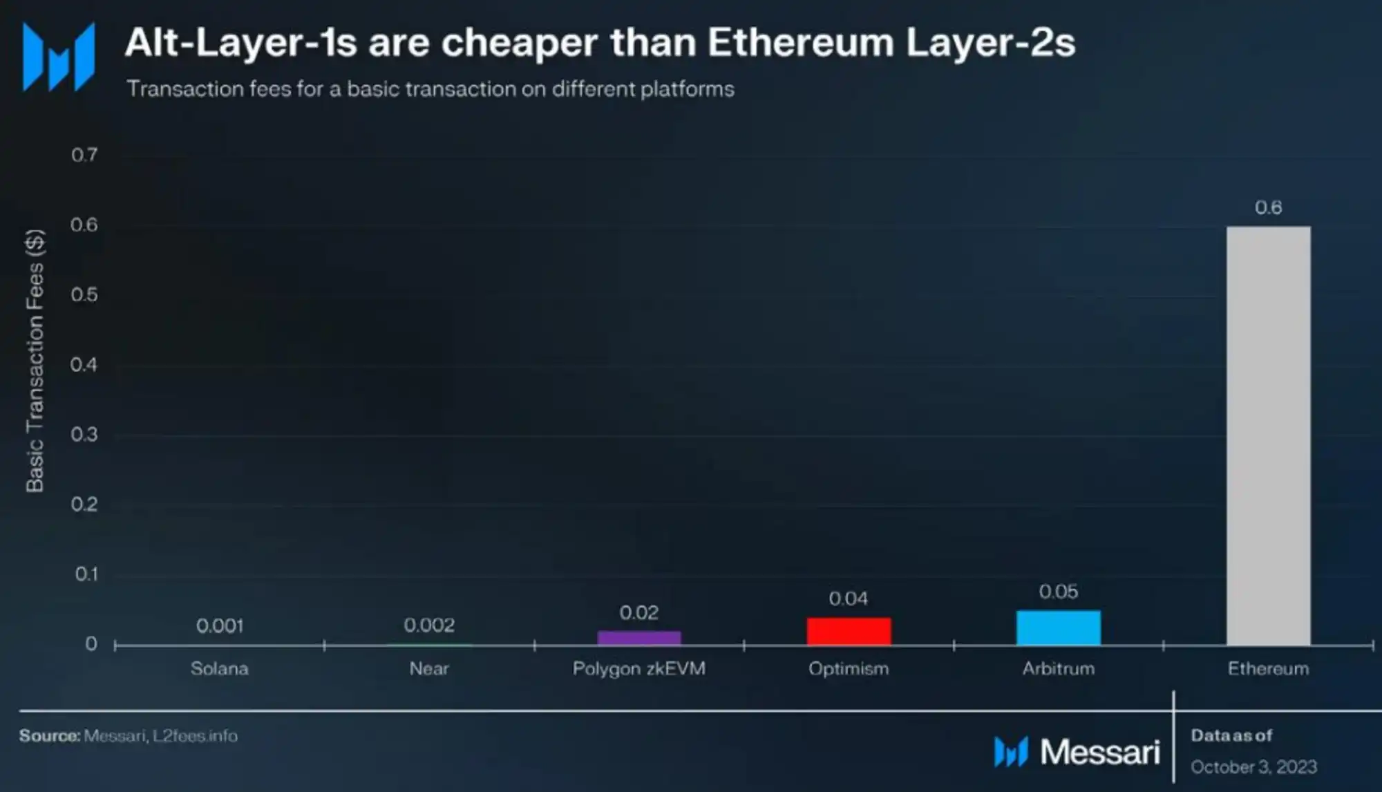 ETH 目前处于两难的境地。对机构的吸引力不如 BTC 数字黄金的叙事,其他的 L0、L1、L2 竞品也在逐渐蚕食以太坊上的交易量。尽管目前来看,ETH 的投资性价比较低,但 ETH 的坎昆升级仍然值得关注。以太坊的坎昆升级能够降低 90%-99% 的 Rollup 的交易成本,使得 Rollup 与其他 Alt L1s 一样便宜。坎昆升级的交付日是最值得关注的日期之一。