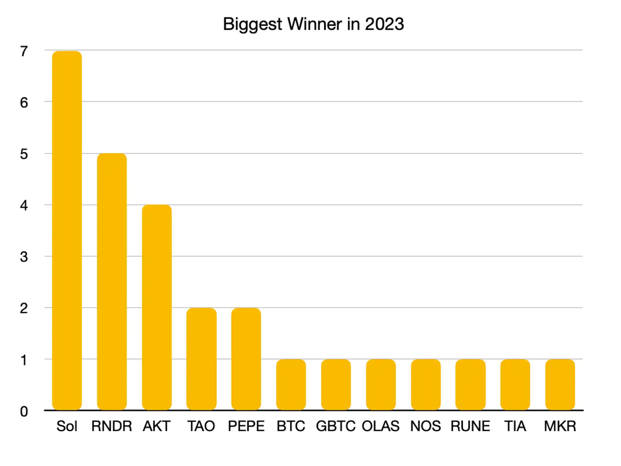 最有意思的莫过于 Messari 公开的分析师持仓。下图为 2023 年 Messari 分析师最大涨幅的持仓币种分布图。可以看到,分析师们的主要盈利来自于 Solana 生态以及 AI + DePIN 概念。这也反映了分析师们很好地抓住了本轮上涨行情的头部叙事。