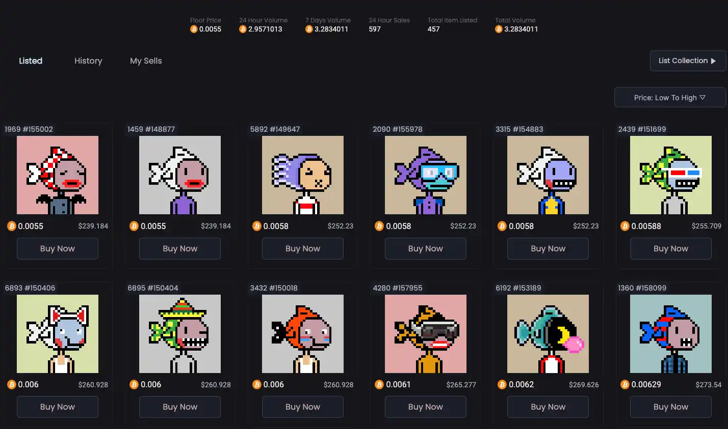 FISHFACEMAN 是 12 月 23 日开启 Dmint 的 NFT 项目,总量一万个,铸造的 GAS 成本价约为 50U,在上线 Atomical Market 交易市场后,最高涨至 300U,是目前的龙二项目。