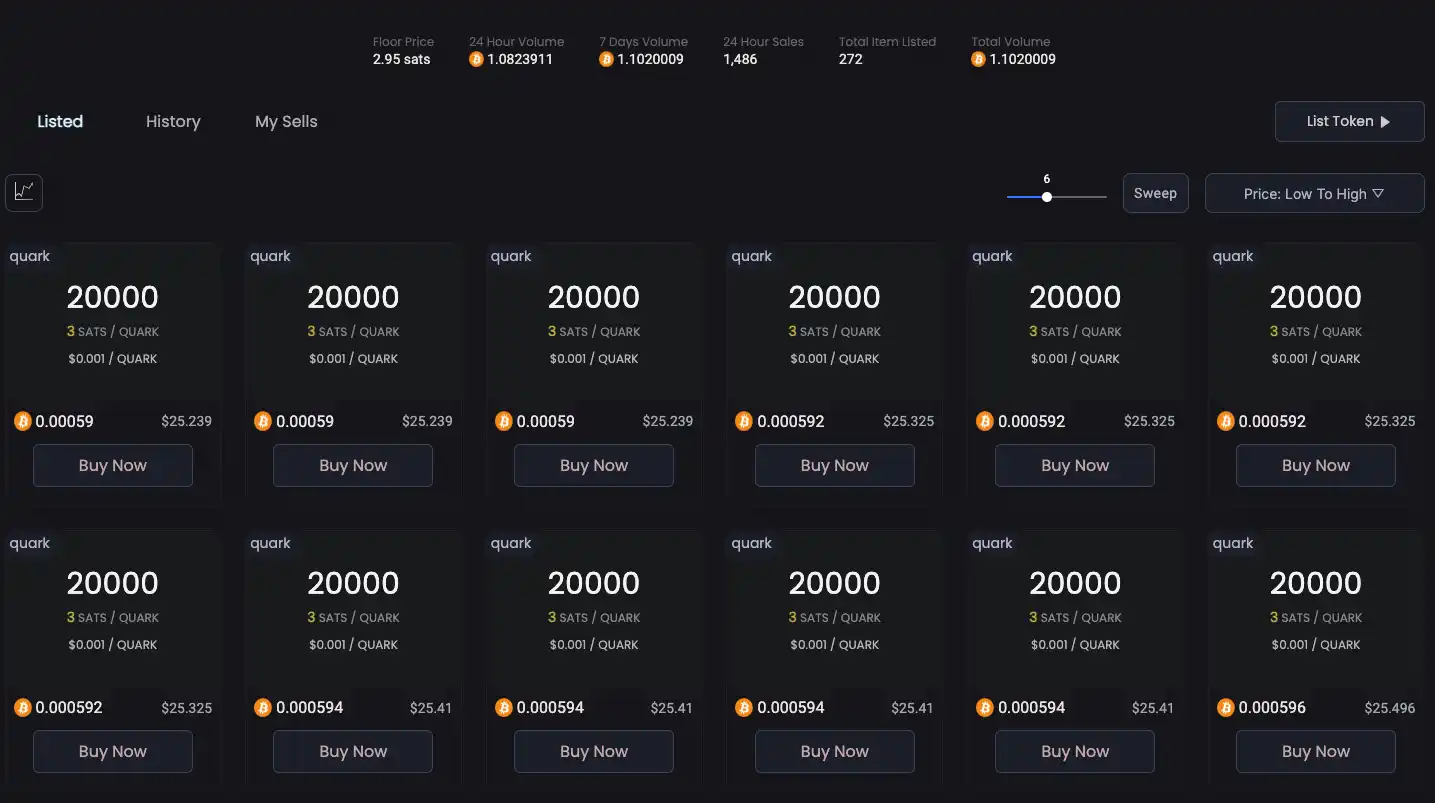 总供应量为 50 万张,每张 2 万个币。目前,打一张成本约为 25u 左右。据 Atomical Market 数据,截至撰稿时,QUARK 价格为 0.001 美元,市值超 34 万美元,24 小时交易量超 4.3 万美元。